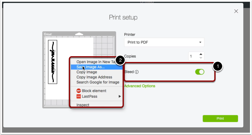 Now this stuff is pretty important we need to make sure we have a couple things here first is the bleed option it needs to be turned on that will be indicated by a green icon. Next we need to hover or mouse over the Cricut mat and right click on the image and choose save image as.