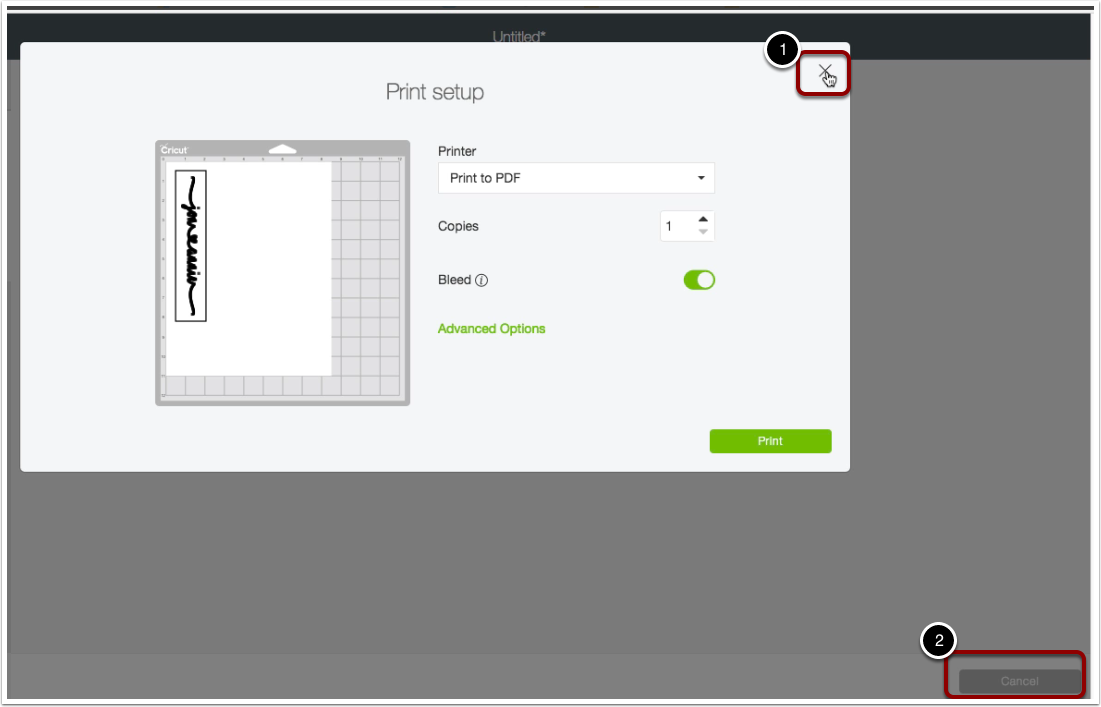Now we need to go back to the canvas so we can cancel out of everything we do not need to print we do not need a cut anything at this point.