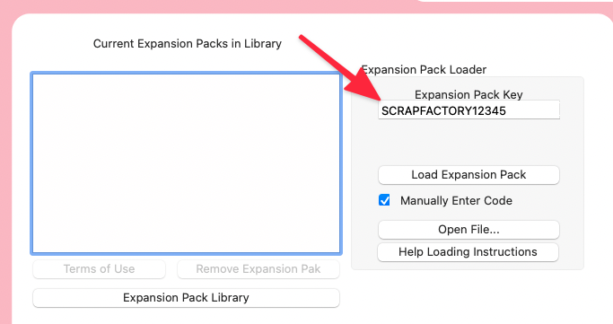 The arrow is pointing to the new field box that you should see once you click the checkmark of Manually Enter Code. To get the basic standard expansion pack you can type in the following SCRAPFACTORY12345.